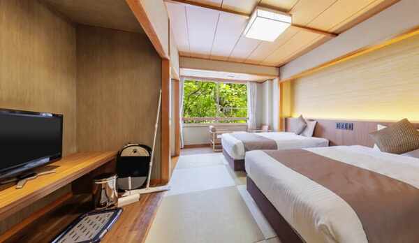 敷地内より湧出する温泉で湯浴みができる「塩原温泉 常磐ホテル」。開放的な大浴場や庭園風の貸切露天風呂を完備しています。客室は、シンプルな和室や畳にシモンズ製ベッドを配した客室、約7名まで宿泊可能なモダンな和洋室を用意。夕食は、地元の野菜や山菜、那須高原牛など旬の食材を使用した会席料理や鍋料理をいただくことができます。JR那須塩原駅より車で約35分、箒川にかかる「紅の吊橋」まで徒歩約5分です。