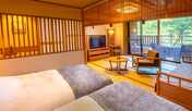 箒川の畔に佇む旅館。川の流れに寄り添うように建つ客室は、全室に離露天風呂または半露天風呂を完備した全10室の離れを用意。風情ある庭を備えた和モダンな雰囲気の和洋室や、スタイリッシュなインテリアを配した洋室、吹き抜けの天井いっぱいに広がる大きな窓やハンモック付きのテラスが特徴のメゾネットタイプなどを揃えています。館内には、角形や丸型の内湯や、深さ120cmの露天風呂を備えた大浴場を併設。川風を感じながら温泉につかれる癒やしの空間です。夕食は、とちぎ和牛や産地直送の鮮魚を中心に、新鮮な食材を使用した創作懐石料理をいただくことができます。