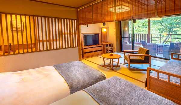 塩原の景色や四季折々の渓谷を望む温泉旅館。囲炉裏やかまどを設えたダイニングでは、日本海の鮮魚や豊かな自然に育まれたとちぎ牛など、旬の地元食材をふんだんに使った月替わりの懐石料理を味わうことができます。館内には、松林の中に佇む野趣あふれる露天風呂をはじめ、大きな石が特徴の大浴場や木々に囲まれた貸切露天風呂を完備しています。客室は、風情ある和室を用意。14畳の客室やベッドを配した客室、露天風呂付きの客室などを揃えています。敷地内には、川のほとりのテラス「季あそび」があり、川のせせらぎを聞きながらくつろぎの時間を過ごせます。