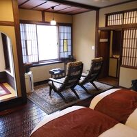 築200年の古民家は、外見もさることながら内部の造りも重厚です。あいにくの雨模様で、部屋からは槍ヶ岳の美しい姿を拝むことはできず。川を眺めてしばし時間を過ごしました。小さい囲炉裏のようなものがありましたが、槍が見えないのなら、本格的な囲炉裏付きの部屋に泊まりたかったです。古い造りなので、木の梁などが低く、背の高い人はよほど気を付けて室内を歩かないと、頭をぶつけます。何も心配しないで歩ける人は、せいぜい身長160センチ位までかと。床も高低差があるので注意が必要です。お風呂は大浴場の他に、大露天(一部時間を除き混浴)などがありますが、女性は湯あみ着を貸してもらえます。加えて、4つの無料貸切風呂があり、空いていれば入れる仕組み。それぞれ趣向が違っていて面白いです。お食事もとても美味しいです。地元の食材をふんだんに用い、見た目も美しく、食してまた味わい深く。スタッフの皆さんも明るく親切。地元愛が感じられます。残念だったのは、コロナの影響で、楽しみにしていた朝のお餅つきがなかったことです。(お餅は食べられます。)