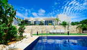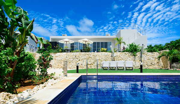 目の前に宮古島の海が広がる、1棟貸しスタイルのリゾートヴィラ。白を基調としたスタイリッシュな外観のヴィラで、別荘のような滞在を楽しむことができます。室内は、バリテイストのインテリアで統一されたリゾート感あふれる空間です。すべてのヴィラに、宮古ブルーの海を望むことができる温水プールやビューバスを完備。リビングやガゼボでは、海を眺めながらぜいたくな時間を過ごすことができます。調理器具や食器、冷蔵庫などを揃えたキッチンも完備。BBQグリルのレンタルも行っています。琉球畳を使用した和室があるヴィラも用意しています。