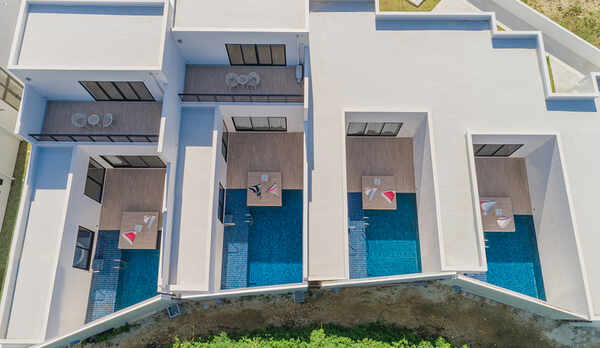 2022年10月にオープンしたA~Eの5棟全てがプライベートインフィニティプール&ジャグジー付ヴィラタイプです。 E棟は室内110平米で伊良部大橋側の端棟です。 ジャグジーから左側に伊良部大橋・中央に宮古島・右側に来間島が見え絶景です。