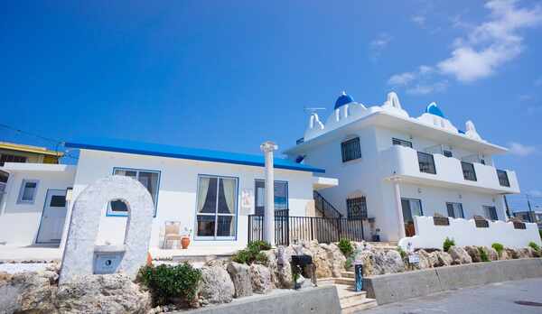 オーシャンビューですが テトラポッドの公園ビュー? 目の前の海には入れません 裏手には集落 住宅地なので 星空観賞はもう少し闇が欲しいかなという感じです。 部屋のインテリアは行ったことがないギリシャ風 お風呂もキレイ快適に使えます