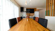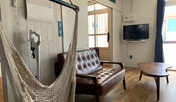 天井の高いメインルームは、採光窓を広くとり日中とても明るく、リビングとその奥にダブルベッドを2台配置しても優にゆとりある広さ。 床全面は無垢の天然木で、快適空間となります。