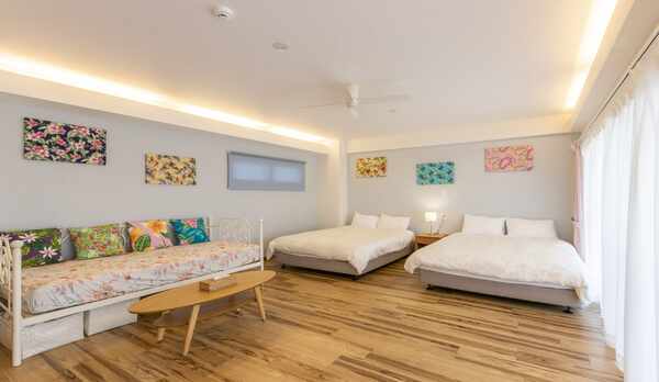 眼前に紺碧の海や緑豊かな森が広がる、1日3組限定のコンドミニアム。1フロア貸切の客室は、約6名まで宿泊可能な広さ165㎡のゆとりある空間。モダンで洗練されたデザインの室内には、広々としたリビングやダイニング、セミダブルベッドを配した3つの寝室などがあります。海を一望できるテラスも併設しており、心地よい風を感じながらくつろぎの時間を過ごせます。調理器具を備えたキッチンや、長期滞在にも便利な洗濯機や乾燥機などをも完備。暮らすように滞在することができます。敷地内には、彩り豊かな手作りピザを味わえるカフェや陶芸体験を楽しめるギャラリーを併設しています。ホテルまでは、沖縄自動車道「石川IC」から車で約8分です。