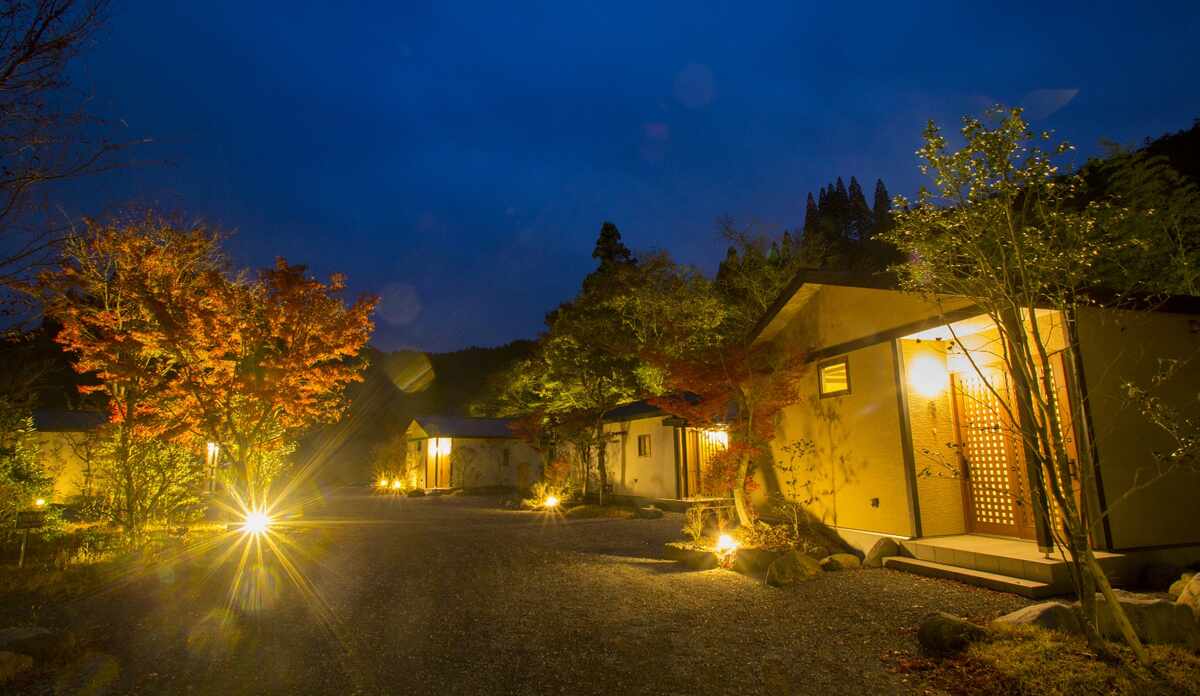 自然豊かな涌蓋山の麓に佇む旅館。川沿いの広大な敷地内に、全10棟の戸建て離れ形式の客室が点在しています。全室に露天風呂を備えており、プライベートな空間で宝仙寺温泉を堪能することができます。眼前に川や木々が広がる客室や温泉プール付きの客室、ペットと宿泊できる客室などを揃えています。夕食は、洋食を中心としたコース料理とミニビュッフェを用意。朝食は地元食材を使用した洋食、または和食です。敷地内には、貸切岩露天風呂やドッグランを完備しています。周辺には、「九重”夢”大吊橋」や「龍門の滝」などがあります。