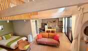 昔ながらの景色が広がる集落に佇む「竹生優庵」。2階建ての客室は、築約130年の歴史ある日本家屋を、当時の趣を残しつつリノベーションした風情溢れる空間。室内には、土間や囲炉裏、畳の香りに包まれる和室などを用意。浴室には、檜の大浴槽や五右衛門風呂をアレンジした小浴槽を完備しています。キッチンや床暖房、エアコンなどの設備も充実。階段を上がると屋根裏部屋があり、職人が伝統工法で葺いた茅葺き屋根の裏側を間近で眺めることができます。宿泊施設までは、JR「虎姫駅」から車で約10分、JR「長浜駅」から車で約15分。周辺の「琵琶湖」まで徒歩約10分のロケーションです。