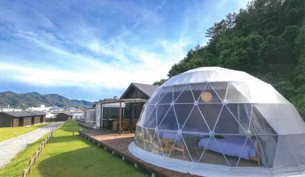 天草の海辺に佇む、1日9組限定のグランピング施設。セミダブルベッドを4台配した大型ドームテントや、ブルーを基調としたオーシャンフロントのドームテント、愛犬と宿泊できるドームテントなどを揃えています。各棟に、リビングスペースやキッチン、バス・トイレを完備。夕食は、地鶏や車海老を中心とした、地域の名産品を堪能できるBBQです。朝食はハンバーガーセットを用意。管理棟には、アルコール類やソフトドリンクを取り揃えたフリードリンクバーを併設しています。周辺では、クルージングやイルカウォッチングなどのアクティビティを楽しむことができます。