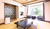 入ってすぐに天井が高く広々としたロビーに目がゆきました。すぐ外の池では鯉が泳いでいるのが見えるですが、ふと気づくと鯉が窓ガラスの内側に。あれ?と思い、よく見ると鯉はロビーの大きなガラスの下を通れるようになっているのですね。ふた部屋続きの部屋はとても広々としていて2人で泊まるにはもったいない位。余裕で10人位は泊まれそうな広さでした。 バスタオルが濃い紫色で、上の階にあるワイン風呂のお湯の色と合わせてるのでしょうか。 1階の大浴場も広々として快適でした。露天風呂へのドアを開けるとすぐ目の前の足元にど、どんという感じで大きな岩が。どこからお湯にはいればいいのかしら?と一瞬考えましたが、少し横へ回って入れました。岩風呂らしい岩風呂でお湯もとてもよく、リラックスさせていただきました。