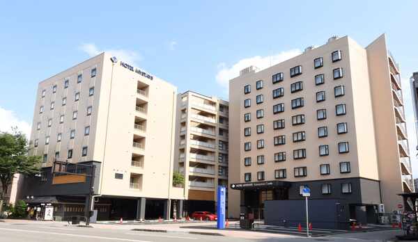JR金沢駅東口より徒歩約10分、商業施設「金沢エムザ」のほど近くに佇むホテル。ホテルより徒歩約3分の「近江町市場」直送の魚介類を使った刺身や、郷土料理の「治部煮」などをいただくことができる朝食ビュッフェが魅力です。客室は、モダンな内装のダブル・ツインを用意。バス・トイレ別の客室や、フットマッサージャーやフェイススチーマーを取り揃えた客室など、さまざまなタイプを取り揃えています。金沢文化の漂う観光地「ひがし茶屋街」へはバスで約10分です。