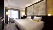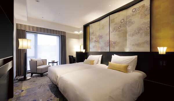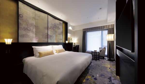 「近江町市場」まで徒歩約1分、「金沢城公園」まで徒歩約3分のホテル。全室に屏風をモチーフにしたヘッドボード設置した客室は、さまざまな種類のツインやキングを用意。黒を基調としたスタイリッシュな内装に金の装飾をあしらった上品な空間で、くつろぎの時間を過ごすことができます。夕食は、能登牛やのどぐろなど、金沢の旬の食材をふんだんに使用したコース料理です。朝食は、金沢の郷土料理「治部煮」や「金沢おでん」をはじめ、ライブキッチンで調理する寿司や天ぷらなど、約60種類のメニューをビュッフェ形式で味わえます。館内には、石川の地酒やオリジナルカクテルを取り揃えたバーを併設しています。