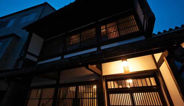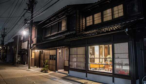 金沢の主計町茶屋街に佇む1棟貸しの町屋。明治31年に建築された元お茶屋の建物を、当時の意匠を残しつつリノベーションした、どこか懐かしい和の空間。広さ約120㎡の2階建て客室には、全7室の3~8畳の和室をはじめ、木の香りが広がる内風呂、調理器具や食器類を揃えたキッチンがあります。縁側では、風情ある坪庭を眺めながらくつろぎの時間を過ごすことができます。朝食は、地元飲食店のモーニングセットを用意。お茶や生け花、書道など伝統文化の体験プログラムも充実しています。町家から「近江町市場」までは徒歩約10分。周辺には飲食店が点在しています。