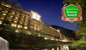 自然に囲まれた箱根湯本温泉に佇む老舗旅館。箱根の四季を感じながら入浴できる、全長約17mの大露天風呂が魅力。円形の石風呂や広々とした内湯、貸切露天風呂もあります。客室は、ツインルームや和室、和洋室や露天風呂付きなどさまざま。ビュッフェ形式の朝食では、駿河湾産の釜揚げしらすや敷地内の湧き水から作られる 「たまだれ豆腐」など、新鮮な魚介類や旬の食材を味わうことができます。庭園には縁結びにご利益がある神社や、パワースポットと言われる「玉簾(たまだれ)の瀧」、茶屋などがあり、浴衣で散策をすることも。