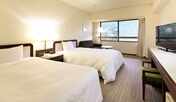 部屋にお風呂が有る、セミダブルのツインベッドのゆったりできるホテルです