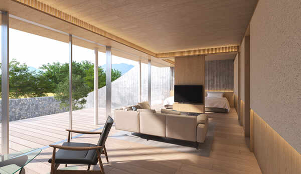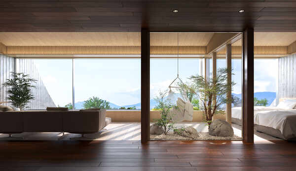 箱根の自然と静けさに囲まれた和を感じることのできる1日1組限定のホテル。宿泊者専用の日本庭園が広がり、四季折々の美しい風景を楽しむことができます。46.3㎡の広々とした和モダンの客室は、ベッドルームと庭園を眺めることができるリビングやテラスデッキを完備。また、ナイトウェアやボディスポンジなどのアメニティも充実。広々としたバスルームや洗濯乾燥機なども備わっており、長期滞在にも便利です。コーヒーやお茶なども用意されており、庭園を見ながら癒やしのひとときを過ごすことができます。アクセスは、バス停の「仙石案内所前」で下車後、徒歩約9分の距離にあり、駐車場も完備してます。