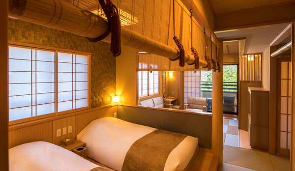 日本画を中心とした絵画や音楽に彩られた空間で、癒しの時間を過ごせます。毎週土曜にはクラシックの生演奏を実施しており、ピアノの音色を楽しむことができます。客室は、畳の小上がり付きツインルームや畳にベッドを配した和室ツインのほか、温泉内風呂付き客室などを用意しています。館内には、温泉大浴場や貸切半露天風呂を完備。食事は、旬の食材を使用した和食会席料理をいただけます。敷地内に散策路を設けており、季節の花々や蛇骨川を眺めながら散策ができます。箱根登山鉄道小涌谷駅とホテル間で送迎バスを運行しています。