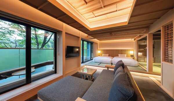 箱根の四季折々の自然と歴史的な風情を感じることができる旅館。京都の「町家」の要素を取り入れ、箱根の豊かな自然環境と調和したデザインが特徴です。客室は、ツインルームやキングルームなどの多彩なタイプを用意。各客室には専用の露天風呂または半露天風呂を完備し、プライベートな空間で温泉を楽しむことができるのが魅力です。露天風呂からは箱根の山々を眺めることができ、温泉に浸かりながら心身ともにリラックスするひとときを過ごすことができます。食事は囲炉裏にて温かい空間で、地元の素材と京都のおばんざいを融合させた囲炉裏朝食や夕食を堪能できます。箱根登山鉄道「宮ノ下駅」から徒歩約15分、小田原厚木道路「山崎IC」から車で約30分のロケーションです。