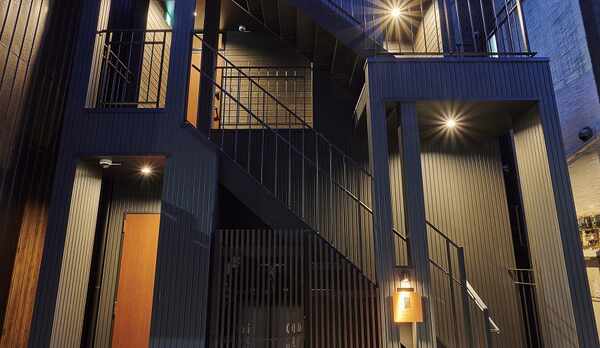 博多中州に佇む、隠れ家のような宿泊施設。わずか3室の客室は、メゾネットタイプ。全室に濃灰色を基調としたシックな檜風呂を完備しており、木の香りに包まれながら入浴することができます。小石原焼の食器や調理家電を揃えたキッチンや、洗濯機付きの「博多」や「玄海」、ダイニングテーブルやIHコンロを備えた50㎡以上のゆとりある「古門戸」を用意。四季折々の坪庭を眺めることができる客室もあります。寝具はエアウィーヴ製マットレスを採用。室内には、Wi-Fiや空気清浄機を設置しています。宿泊施設までは、 福岡市地下鉄「中洲川端駅」7番出口より徒歩約5分です。
