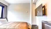 部屋は狭いけれど、機能的。地下鉄駅から徒歩3分以内、市内中心部にあるビジネスホテル