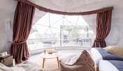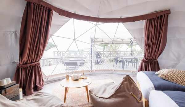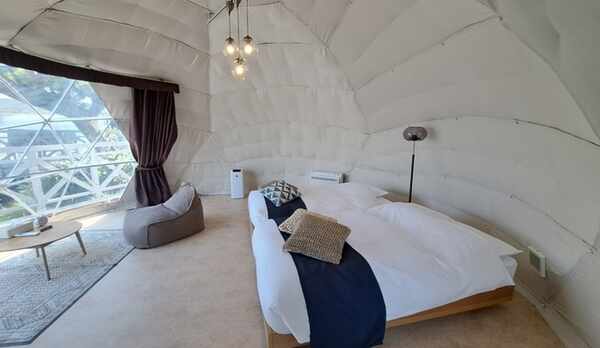 糸島の自然を感じられるグランピング施設。さまざまなアクティビティが魅力のひとつ。開放的な空間の体験ブースでは、キャンドル作りやブッシュクラフト体験、薪割り体験やピザ作り体験などを楽しむことができます。客室は、海や山を見渡せるウッドデッキ付きのドームテントや、ジェットバスを備えたラグジュアリーなログハウスがあり、ニーズに合わせて選ぶことができます。夕食は地元の食材を活かしたオリジナルのコース料理を、朝食はスープやホットサンドなどを味わうことができます。アクセスは、前原ICより車で約30分。周辺にはコンビニやスーパーがあります。