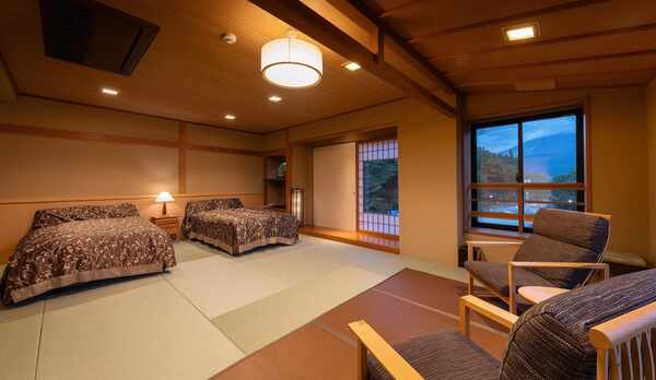 大正13年創業、自然豊かな田沢湖の畔に佇む老舗旅館。畳敷きの館内は、素足で過ごせる心地のよい空間です。ロビーでは、「秋田ふき」をデザインに取り入れた照明や襖、「秋田杉」を使用した曲げわっぱなど、秋田らしいしつらえが出迎えてくれます。客室は、専用ダイニングルームが付いた和室や和洋室を用意。湖に沈む夕陽や秋田駒ヶ岳を眺めることができる客室もあります。夕食は、きりたんぽ鍋や山の芋鍋など、秋田の味覚を堪能できる郷土懐石料理です。露天風呂や大浴場、約20畳の広さを誇る貸切風呂では、温泉に浸かることができます。