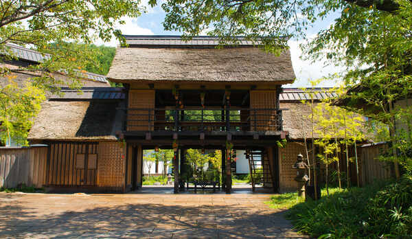 自然豊かな田園風景のなかに、風情あるかやぶき家屋や古民家が広がる旅館。重厚な蔵戸を抜けると、武士のかぶとを思わせる屋根が出迎えてくれます。館内には古くは江戸時代の骨董品を展示。客室は、テラスや露天風呂が付いた本館と、ガラス張りのモノレールで上った高台にある別館があります。川場温泉に浸かることができる大浴場は、3つの湯処を用意。それぞれに内湯と露天風呂を完備しています。夕食でいただけるのは、群馬の食材を使用した創作料理。朝食は、新鮮な地元野菜を使った和食を味わうことができます。
