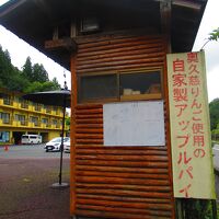 袋田は滝本にある宿 豊年万作の建物横にある小さなログハウスでは自家製アップルパイを販売している。 袋田の滝を展望に来たなら、展望前に予約注文し、帰りに取って帰ると良い。 お値段は4切れで900円。 中にはお土産で4箱5箱購入して帰る観光客もいるようで、一度食べると病みつきになる。 奥久慈自慢の林檎を使って焼いたアップルパイ、確かに美味しい。