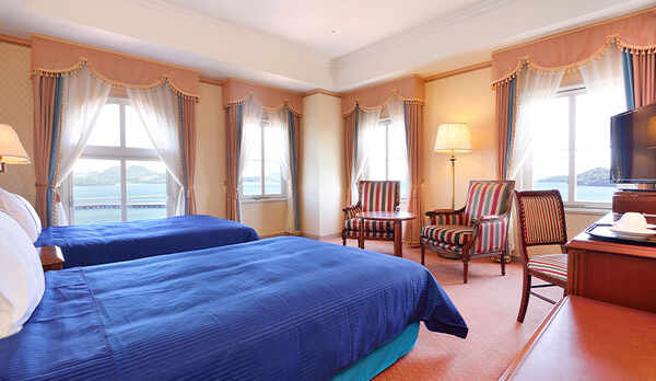 「ハウステンボス」内に佇む、運河に囲まれたラグジュアリーなホテル。ウェルカムエリアとホテル間で宿泊者専用クルーザーを運航しており、チェックイン・チェックアウト時にクルーズを楽しむことができます。クラシカルなインテリアを配した客室は、内海に面した静かなロケーションのスタンダードルームをはじめ、花柄の壁紙やファブリックが華やかさを演出するデザイナーズルームや、洗練されたヨーロッパ調デザインのセミスイートなど、多彩なタイプを揃えています。夕食は、厳選された長崎の食材を堪能できる鉄板焼きです。朝食は、作り立てのオムレツや新鮮な地魚のお造り、日替わりのしゃぶしゃぶなどの豊富なメニューを、ビュッフェ形式でいただくことができます。