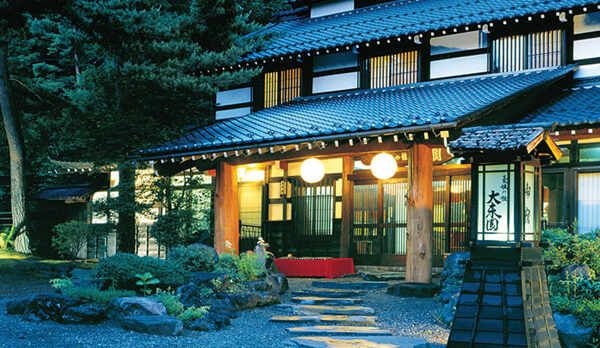 約3万冊の蔵書に囲まれながらワインやウィスキーなどを味わうことができる「ライブラリーラウンジ」が魅力の旅館。大正15年創業、太宰治や柳原白蓮など幾人もの文人歌人が訪れており、重厚な雰囲気の館内には、多くの作品が飾られています。滝の湯川や渓谷の自然を眺めることができる5種類の露天風呂や畳敷きの内風呂を併設。客室は、畳にベッドを配した客室や渓谷を望む和室、坪庭と露天風呂付き客室などがあります。10名の文人たちをイメージした客室も。食事は、凍み豆腐や凍み大根など信州の食材をふんだんに使用した料理です。