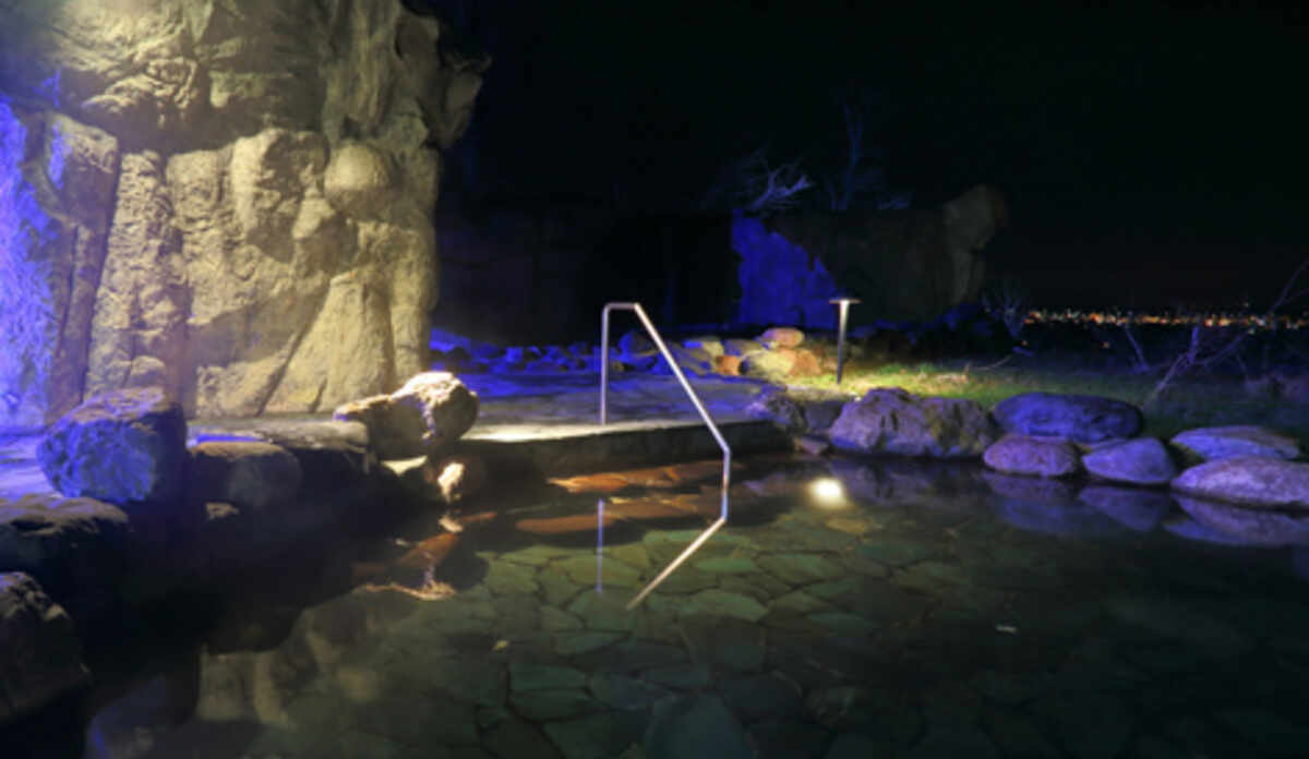 自然を感じながら入浴することができる「岩露天風呂」。夜は星空や石狩平野の夜景を、晴天の日は石狩平野の奥に樺戸連山(ピンネシリ)を見ることができます。
