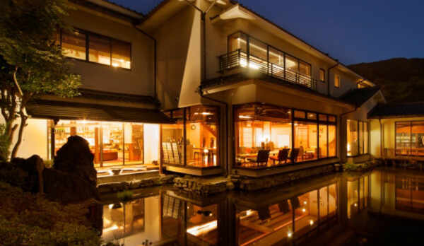 約300坪の優美な日本庭園を囲うように造られた数寄屋造りの旅館。風情漂う客室は、和室や和洋室などを用意。全室に蓮台寺温泉の湯につかることができる露天風呂、または内風呂を完備しています。夕食は金目鯛の煮付けやしゃぶしゃぶ、鮑のお造りなどの下田港に水揚げされる新鮮な魚介類をふんだんに使用した会席料理をいただくことができます。朝食は、あじの干物などを味わえる和定食です。大浴場には、巨岩を配した露天風呂や開放的な大きなガラス窓が付いた内湯を完備。全館畳敷きの館内には、足湯や庭園を臨めるロビーラウンジなどを併設しています。