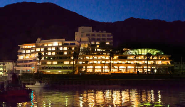 目の前に伊豆下田湾を望む「黒船ホテル」。展望露天風呂は、下田湾を一面に望む場所にあり、心地よい潮風を感じながら温泉に浸かれます。客室は、露天風呂付きの離れや客室、茶室や地中海をテーマにしたコンセプトルームなどが揃っており、全室オーシャンビューで下田湾の美しい海を独り占めできます。夕食は伊豆の3大美味、「金目鯛、伊勢海老、あわび」を中心に、旬の野菜や和牛など地元の食材を使った料理がいただけます。