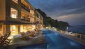 コバルトブルーの海を間近に望むオーシャンビューの隠れ家ホテル。全8室の客室は、寝湯やDVDを備えた温泉露天風呂付きのスイートルーム。岩盤浴を完備した客室も揃えています。食事は、ガーデンテラスやレストランテラスにて用意。目の前に広がる海の景色とともに、本格フレンチや和懐石を堪能することができます。敷地内には、オーシャンフロントの屋外プールを併設。外浦海岸の左方に位置し、まるでプライベートビーチのように利用することができます。プール横には、ジェットバスとフィンランド式サウナを設置。アクセスは、伊豆急「下田駅」より車で約5分のロケーションで、駅からホテルまでは送迎を行っています。