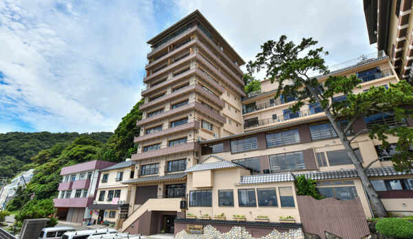 地上約35mから雄大な相模湾や大島を一望する、最上階の露天風呂が自慢です。展望大浴場や貸切露天風呂でも温泉に浸かることができます。波しぶきがかかるほど海を間近に望む周辺の温泉施設「黒根岩風呂」も利用可能です。夕食は、目の前の北川漁港で獲れた新鮮な魚介類を使用した刺身や煮魚などがいただける会席コース料理です。全室オーシャンビューの客室は、風情ある和室を用意。露天風呂付き客室もあります。JR伊東線・伊豆急行線「伊豆北川駅」から送迎バスも運行。静かな海辺に佇むロケーションです。