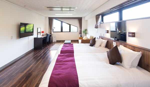 山や海に囲まれた大室山の麓に建つホテル。大浴場では、手足を伸ばして温泉に浸かることができます。約70㎡の広々とした客室は、1LDKや2LDKタイプを用意。愛犬と宿泊できる専用棟や伊豆急行線の鉄道ジオラマを設置した客室なども揃えています。全室に、調理器具を備えたキッチンや、長期滞在にも便利な洗濯乾燥機などを完備しています。最寄り駅の伊豆急行線「伊豆高原駅」からは車で約7分。周辺では、美術館巡りやトレッキングなどを楽しめます。