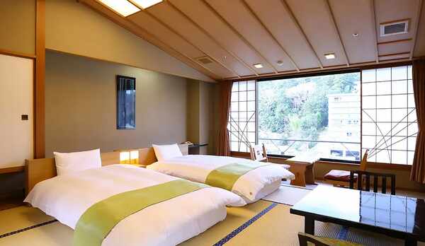 桂川に面し、季節うつろう景色を眺めながら過ごすことができる旅館。大正ロマンの雰囲気漂う回廊を囲むように、修善寺温泉を引湯した開放的な大湯殿や自然の風景を望む露天風呂、貸切風呂などが配置されています。客室は、純和風の和室をはじめ、和モダンな和洋室、露天風呂付きの離れ、桂川にかかる吊り橋を渡った先にある半露天風呂付き客室などを用意。食事は、地元の山菜や伊豆の海の幸を使用した会席料理をいただくことができます。館内には、宴会場などを併設。伊豆箱根鉄道修善寺駅より車で約8分です。