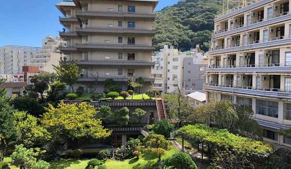 建物の規模や部屋の作りなど、どこを見ても豪華なホテルで昭和の一流ホテルだったのだと感じます。大きな庭園もあり錦鯉が何匹も泳いでいたりします。伊東園だと手入れが行き届かないこともありますが、こちらは最低限の手入れはされているようで不快感はありません。 食事は、伊東園の画一メニューに加えて、独自料理もあり、満足できる内容でした。また最上階のレストランからは、山の斜面に広がる熱海の街を一望できる素晴らしい眺めでした。熱海の伊東園は、伊東園リゾートと謳っていて、タオルが大きかったり、氷が無料だったりと他の伊東園とは違いがありました。