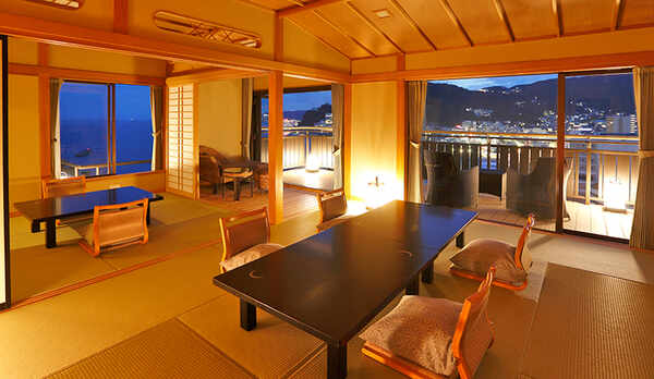 客室や展望貸切露天風呂から熱海の海や水平線に浮かぶ初島、大島を一望する旅館。数寄屋造りの客室は、和室や和洋室、螺旋細工の調度品をしつらえた檜風呂付き客室などを用意。檜や陶器の展望貸切露天風呂や大浴場では、温泉に浸かることができます。客室でいただく食事は、夕食は、熱海の新鮮な山海の幸を使用した季節の創作和食会席、朝食は、干物や彩り豊かな小鉢などの和食です。熱海サンビーチまで徒歩約3分、旅館は熱海温泉の街中に佇んでいます。