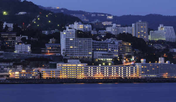 熱海の夜景や海を一望する高台に佇む旅館。館内に足を踏み入れると、侍や花魁をイメージした壁画が出迎えてくれる和モダンな空間。寝湯などを完備した大浴場や貸切露天風呂では、温泉に浸かることができます。落ち着いた雰囲気の客室は、広々としたファミリー室や和洋室などを用意。熱海の街並みを見下ろすことができる温泉露天風呂付き客室もあります。夕食は、伊勢海老や地魚などの海の幸をはじめ、地元の旬の食材を使用した季節の懐石コースです。周辺には、「来宮神社」や「MOA美術館」などがあります。