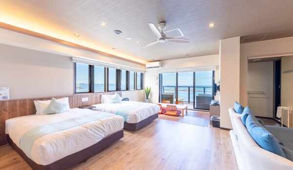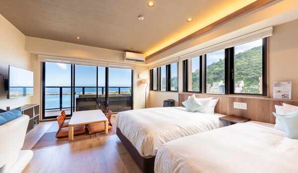 相模湾や熱海の街並みを一望する露天風呂が魅力のホテル。屋上露天風呂や浴場、貸切露天風呂で温泉に浸かることができます。客室は、木の温もりあふれるツインやトリプル。ベッドは、シーリー製の「クラウドフィット」を採用しています。客室によって、熱海市街地を見渡すことができます。朝食は、日替わりのパンやサラダなどをボックス形式で用意。眺望の良い屋上テラスで、景色を眺めながらいただくこともできます。館内にはマンガコーナーも設置。JR熱海駅から徒歩約7分です。