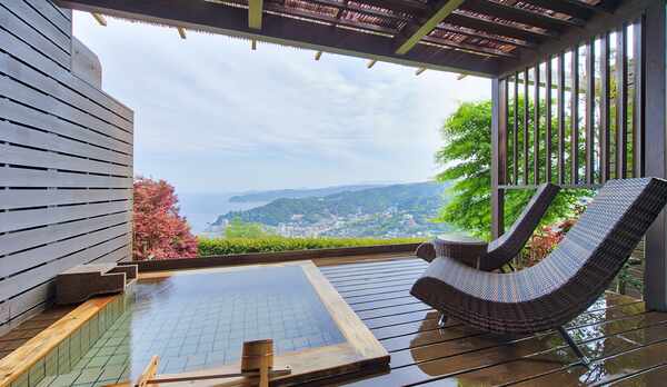 太平洋を一望できるオーシャンビューの露天風呂付き客室が魅力のホテル。客室は、全室30㎡以上の広々とした空間に露天風呂を配し、シモンズ製のベッドを採用しています。温泉を引湯した見晴らしの良い展望露天風呂や炭酸泉風呂、サウナ、水風呂などを備えた大浴場も自慢の1つ。レストランでは、地元食材を取り入れた海の幸メインのメニューをビュッフェ形式でいただくことができます。館内には、カラオケルームや屋上テラスなども用意。温泉プール「マリンスパあたみ」まで徒歩約5分、大正時代の文化財「起雲閣」まで徒歩約7分です。