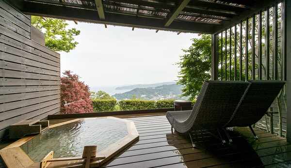 眼下に相模湾を望む高台に佇む、和の美しさを織り込んだラグジュアリーなホテル。全室46㎡以上のゆとりのある客室が魅力で、露天風呂付きのスーペリアツインや温泉付きの和洋室などを揃えています。最上階にはコンセプトの異なる4つのスイートルームを用意。熱海の街並みや刻々と変化する海景色を見渡せる癒やしの空間です。夕食は、四季折々の山海の幸を使用した和洋折衷の創作料理などを味わうことができます。館内には、開放感のある半露天浴場や窓から海を眺められる貸切風呂を完備。星空テラスや焚火のあるエントランステラスなど、パブリックスペースも充実しています。
