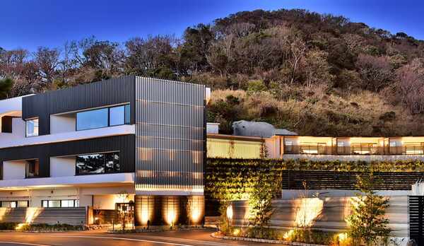 西伊豆・堂ヶ島の海沿いに位置する1日6組限定の旅館。紺碧の海や島々を一望できるロケーションが魅力。客室は、渡り廊下でつながった2棟にわかれ、温泉露天風呂を備えたテラス付きの「ゲストルーム」と、和の設えにダイニングテーブルを配置した「プライベートルーム」の2室を1組で利用することができます。全室にこだわりのインテリアを採用したラグジュアリーな空間。プライベートルームからは、海に沈む夕陽や赤く染まる堂ヶ島の景色を眺めることができます。夕食は、駿河湾の鮮魚や静岡名産牛、地元の朝採れ野菜などを使った創作フレンチです。館内には、エステルームとジェットバスを完備した2種類の貸切ルームも併設しています。