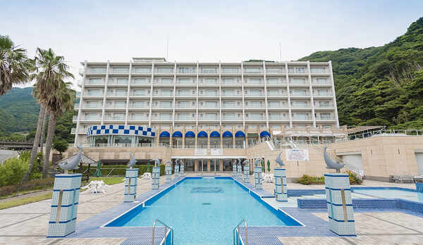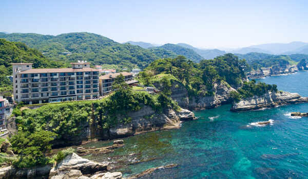 世界ジオパークに認定された伊豆半島の、「堂ヶ島」の岬に佇むホテル。眼前に三四郎島と駿河湾の景色が広がる展望露天風呂や、展望大浴場を完備しています。岬を眺めながら浸かれる貸切露天風呂もあります。全室オーシャンビューの客室は、和室・和洋室・洋室を用意。露天風呂付きの客室もあります。夕食は、海鮮焼きや牛ステーキなど地元の山海の幸を使用した会席料理をいただくことができます。朝食はアジの干物や野菜を味わえる和食膳です。敷地内には展望台やプライベートビーチなどを併設。土肥港より車で約30分です。