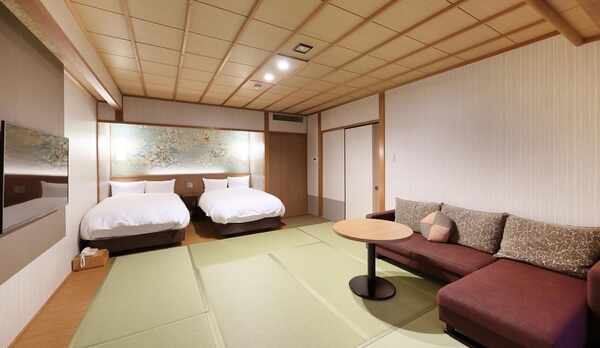 心地よい音楽を聴きながら温泉に浸かることができる露天風呂が魅力。和の趣を感じる庭園の景色を楽しむことができます。男湯には四国の青石を使用した大浴場を、女湯には赤御影石造りの大浴場を完備しています。夕食はのどぐろや鮑など、境港で水揚げした新鮮な魚介類を味わえる会席料理を、朝食は和食をいただけます。客室は、和室や和洋室などを用意。すべての客室にマッサージチェアを設置しています。館内のロビーや客室など、随所に日展作家の絵画や書を展示。食事処にも浮世絵が飾られており、美に囲まれたくつろぎの空間です。