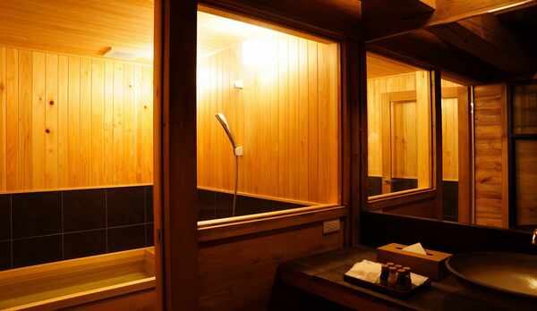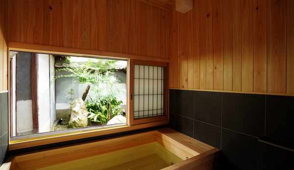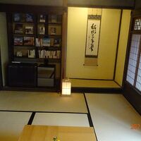 「内蔵」という部屋に宿泊しました。とても広い部屋で、吹き抜けには屋根裏空間が見え、壁面にはたくさんの本が飾られ、のんびりと読書できました。古い造りですが、水回りはリノベーションしているため、蓋の開閉もオートなウォシュレット、3人は入れそうな