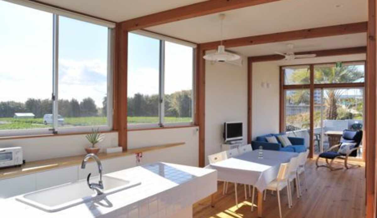南房総の白浜に佇む、全3棟のデザイナーズコテージ。大きな窓からやわらかな光が差し込む空間で、暮らすように過ごすことができます。全棟に、自炊を楽しめるキッチンや、楽器を揃えたスタジオ、BBQスペースを用意。海を望む「メインコテージ」には、3ベッドルームやロフトがあり、リビングには北欧テイストの家具をしつらえています。客船をイメージした「サウスコテージ」には、貸切露天風呂や2ベッドルームを用意。窓からは刻一刻と表情を変える川の景色や、水鳥たちの姿を眺めることができます。2階建ての「イーストコテージ」は、青いモザイクタイルやレンガなど、随所に遊び心あるデザインを施した空間。3ベッドルームを用意しており、リビングやデッキからは白浜の美しい花畑を望むことができます。